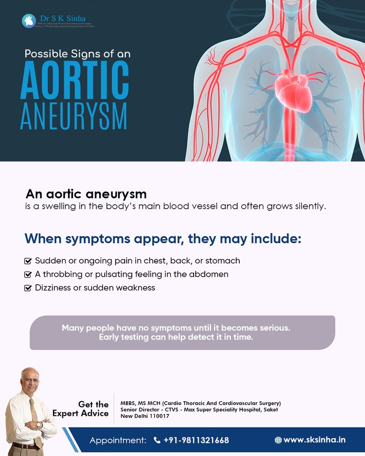 You should seek expert cardiac advice if you experience ongoing chest discomfort, breathlessness, fainting episodes, or if scans show artery enlargement. Early testing and specialist review help decide whether medicines, monitoring, or aortic aneurysm surgery in Delhi may be needed. Quick action can reduce the risk of complications and improve recovery outcomes. Many patients consult experienced cardiac expert sksinha for proper diagnosis and step-by-step treatment guidance. For appointment and evaluation support, you can connect directly at +91-9811321668 and discuss the most suitable care plan based on symptoms and reports.
